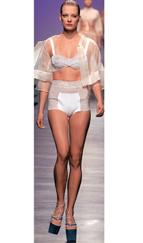 Bottega Veneta, meanwhile, continued last season's boudoir theme at its Milan show with some seductive styles in a palette of nude shades, including a retro bustier that looked great with a pencil skirt – less so paired with knickers under a short coat. And British label Preen created a fresh sartorial dilemma at its New York show with a lacy see-through body: while forgoing a bra may have been a good look for the model on the catwalk, for us mortals it poses a new problem: what underwear to wear under underwear? Time to reset that alarm clock...