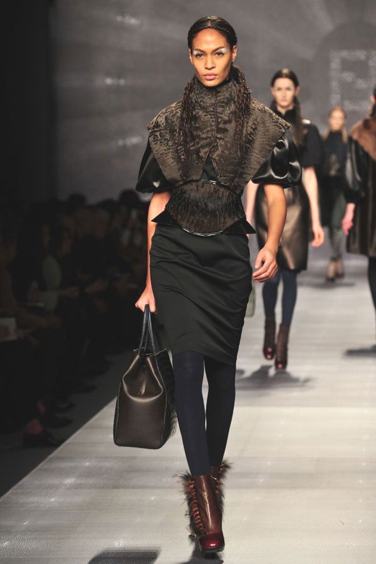 Karl Lagerfeld's collection for Fendi is sure to divide opinion, with its use of exotic furs and skins. Tufted fox decorated the shoulders of cable- knit sweaters, while goat hair was dyed canary yellow for a shaggy and striking finale. Whatever the ethical dilemmas, there is a demand for such materials in Italy – and, most importantly, the emerging markets – and this is a collection sure to satisfy those tastes.