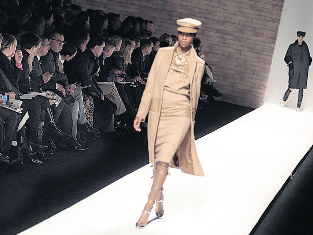 Meanwhile, the catwalk schedule continued with MaxMara and Fendi yesterday showing two very different versions of luxury. The former developed several trends to have emerged previously in both New York and London, with military-inspired olive greatcoats made from double cashmere, as well as houndstooth and Prince of Wales check knits embellished with sparkling crystals.