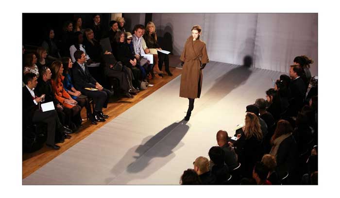 Prints, including a black and white teardrop print on a chiffon pussy-bow blouse, were subtle, and the colour palette was dark – predominantly black and grey, with earthier colours. Flashes of understated glamour came from muted gold, gilt brocade trims and flashes of ruby, as well as luxurious evening fabrics.