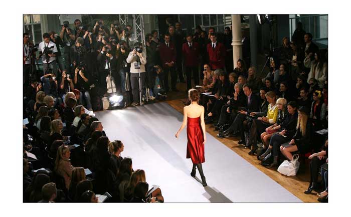 The evening attire was a highlight of Richard Nicholl's collection. The British-born, Australian-raised designer, who only graduated from Central Saint Martins College in 2002, showed black silk cocktail dresses with wide origami-like ribbons around the bust and flowing kaftan maxidresses.