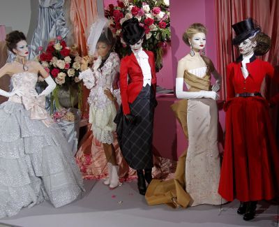 Designer John Galliano's Amazonians brandished riding crops and sported black velvet top hats with fishnet veils over their tightly-fitted jackets with stiff peplums, frothy white neckties, and full riding skirts in scarlet, charcoal grey or traditional checked English tailoring fabrics.