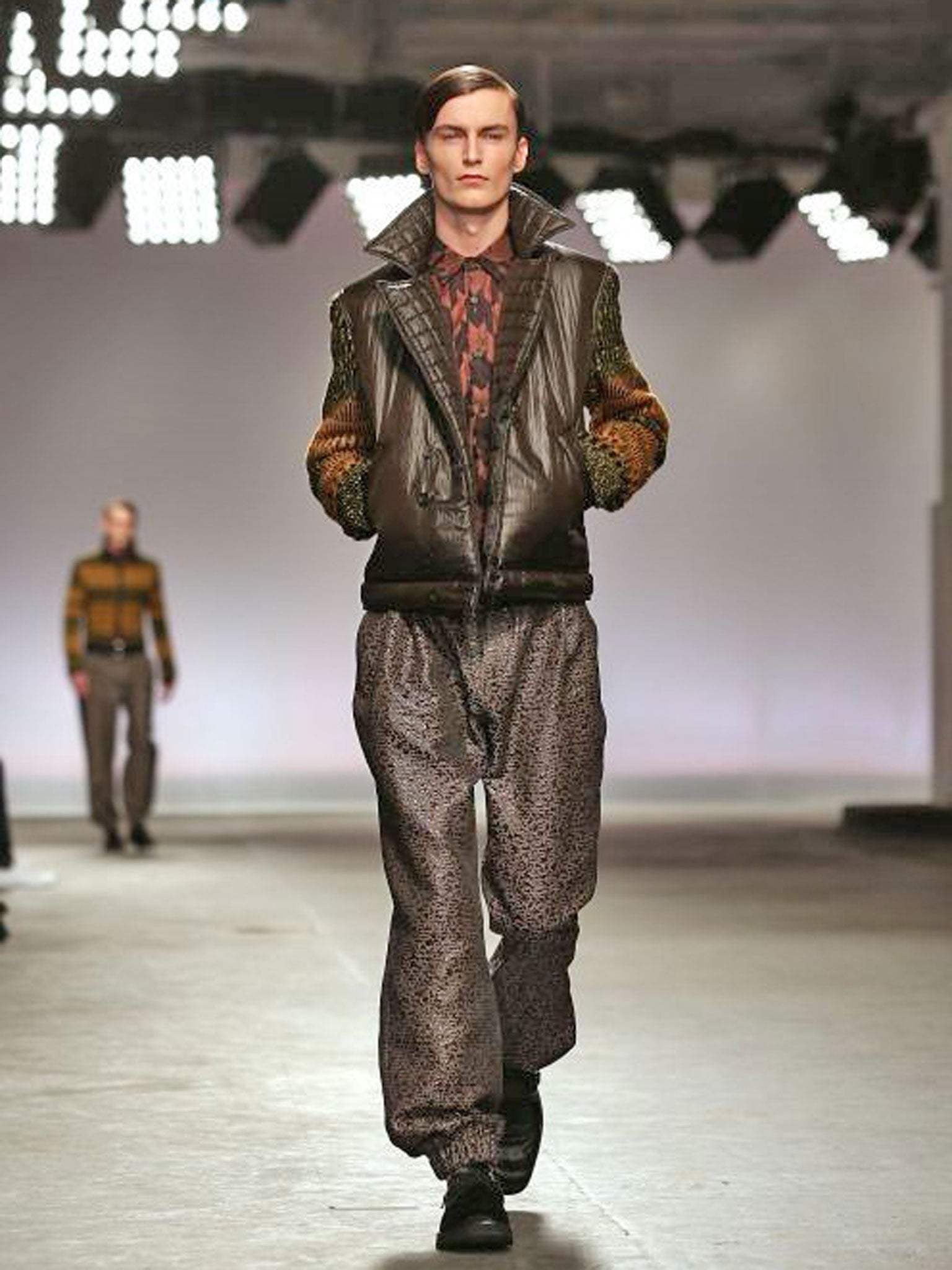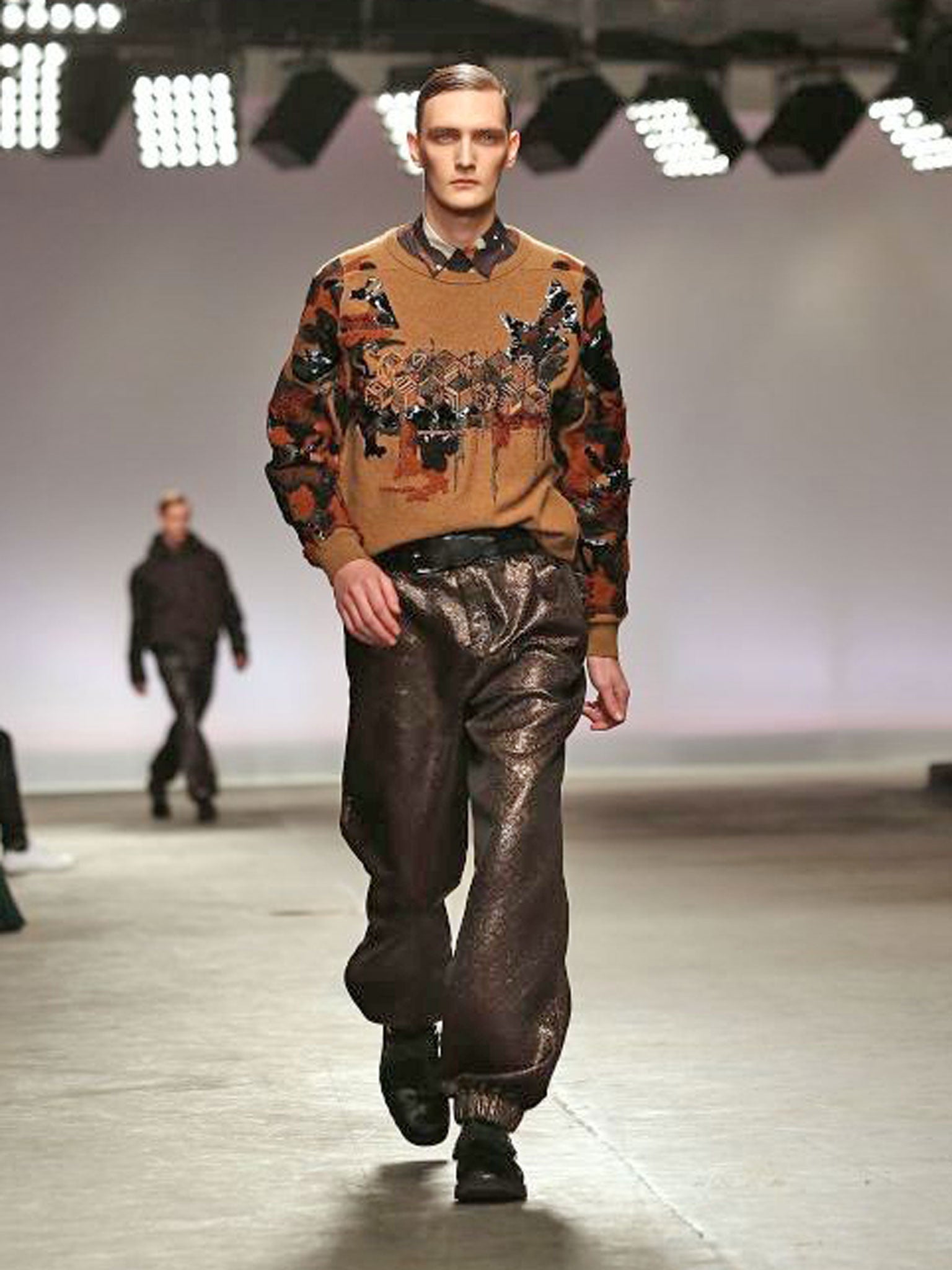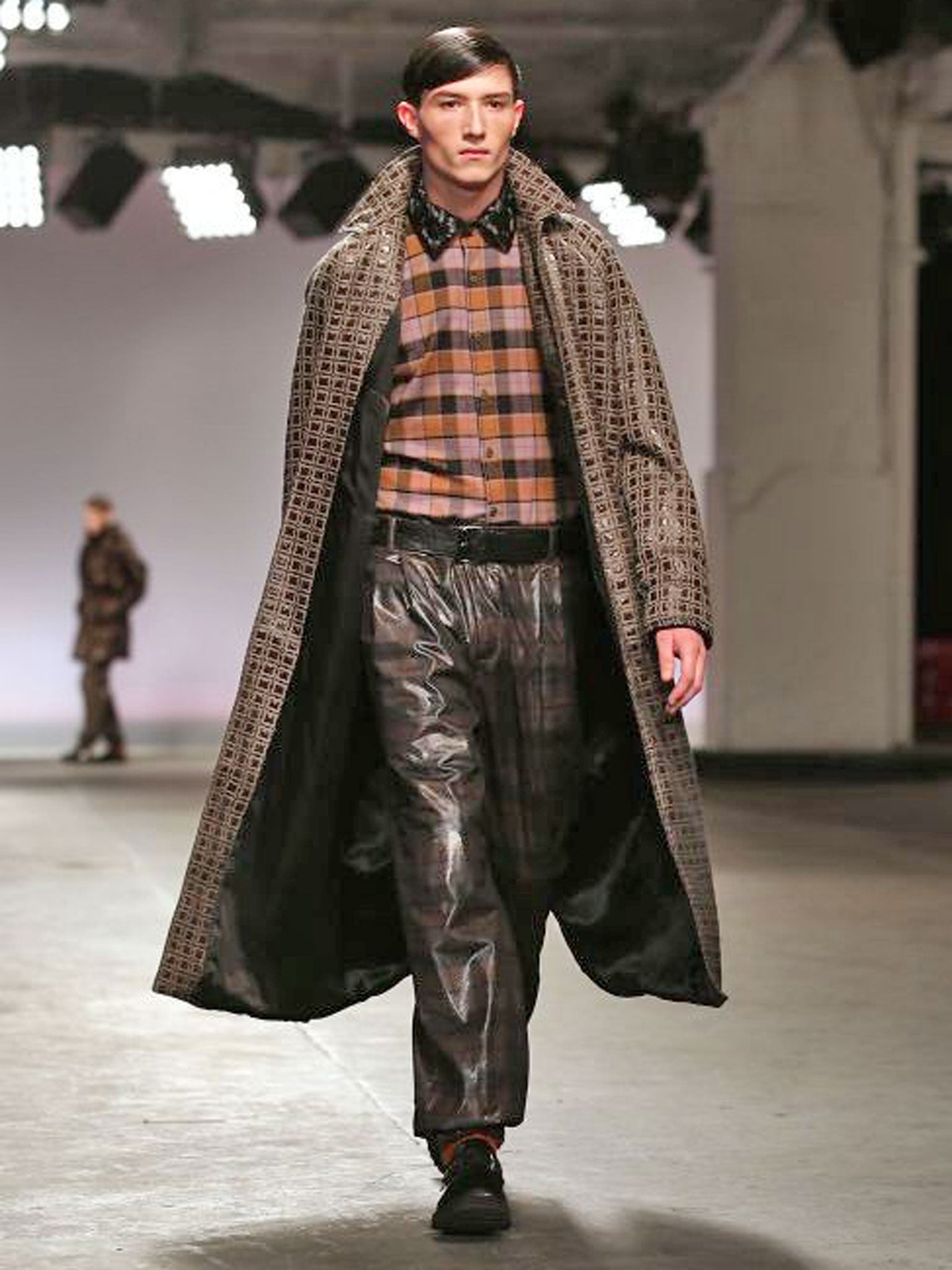 Long used shades of brown, mustard and bottle green, instead experimenting with varied textures to build another dimension to a largely tonal collection. Rubberised printed plaid macs, bugle bead adorned knitwear and bronze jacquard elasticated cuff trousers were accessorised with perspex and horse hair monk strap shoes - the fruit of a collaboration with Kurt Geiger.