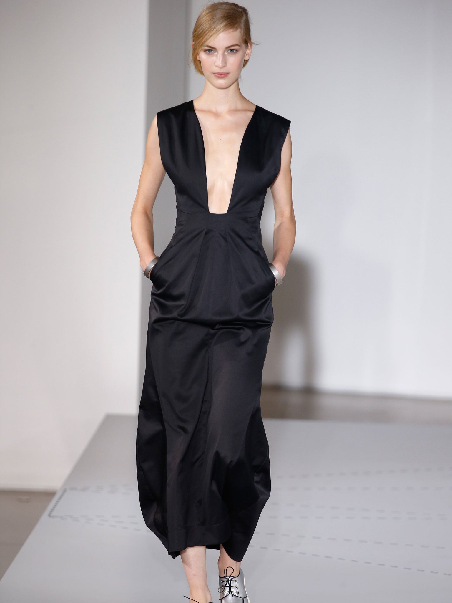 Jil Sander evoked something similar. At least, the crispness and papery cotton textures were there: one outfit looked like it was made from laminated paper, crinkling like a crisp-packet. Most stood proud of the body, jackets pulled into fullness at the back, dropping longer at the front, sleeves wide at the shoulder. Dresses were often scissored open to bare a midriff, a back, the plunge from neck to navel.