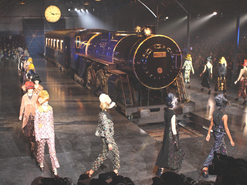 On this, the closing day of the international collections, they stepped out of their carriages and on to the platform, each with their own liveried porter in tow. Louis Vuitton – let's not forget – is the most famous purveyor of luxury luggage in the world and, with that clearly in mind, said smartly clad escorts carried jewelled holdalls in rare skins, hat boxes, cases and more to entirely glamorous effect.