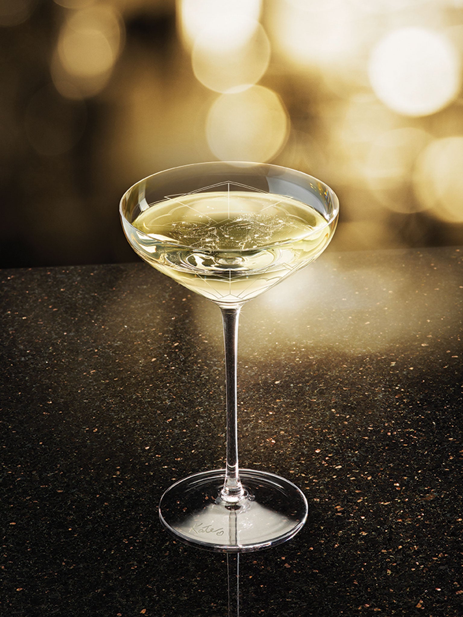 The establishment described the result as an "intricate abstract design reminiscent of Art Deco symmetry which, when held at an angle, shows a beautiful curvy shape” and the coupe has her “Kate” signature accompanied by a small heart on the base, as seen on all her beauty collaborations like for example Rimmel London.