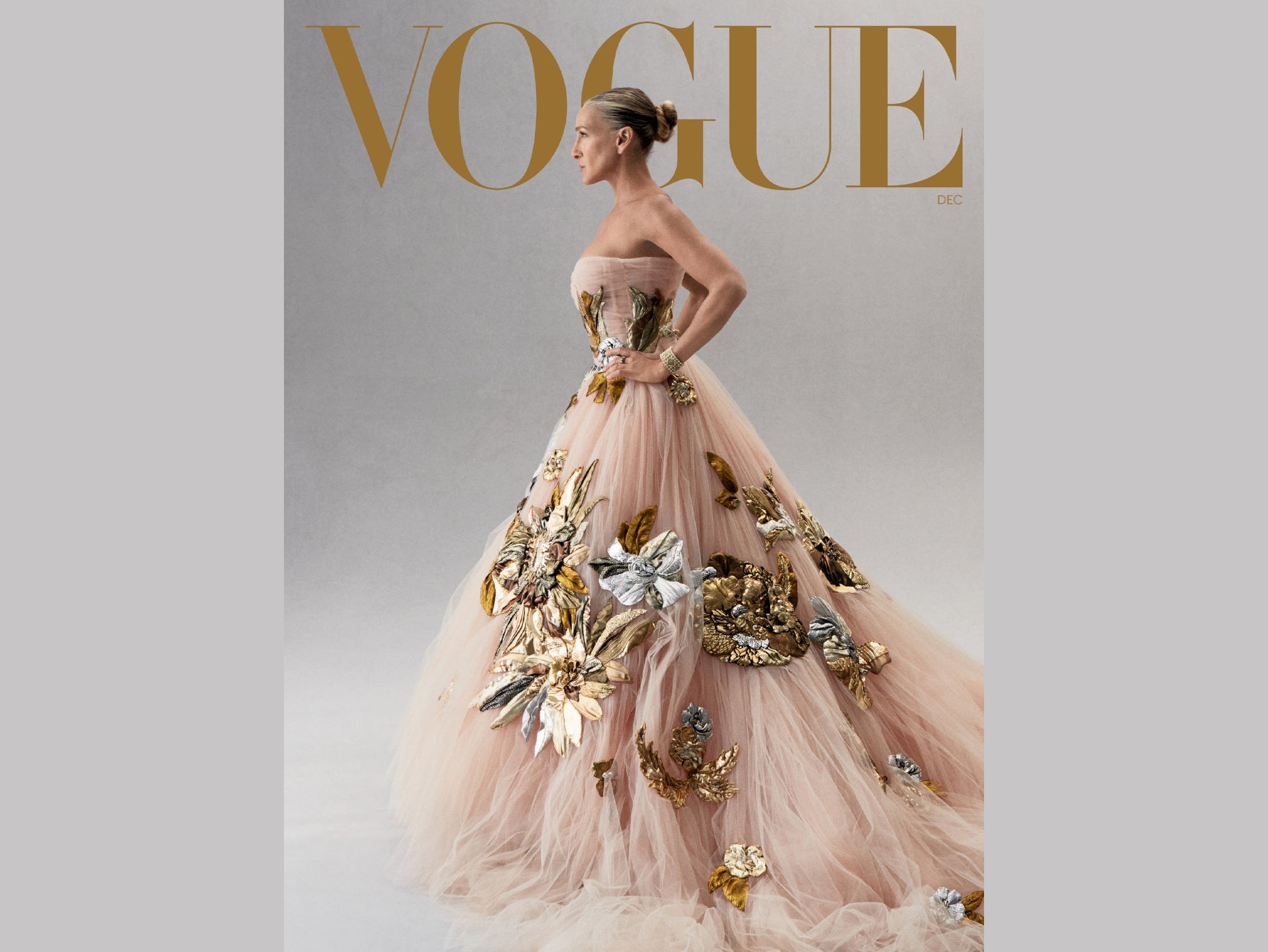 On Vogue’s December cover, Parker wears a tulle Dolce & Gabbana Alta Moda gown embellished with large floral motifs, and her hair is swept back into a sleek bun.