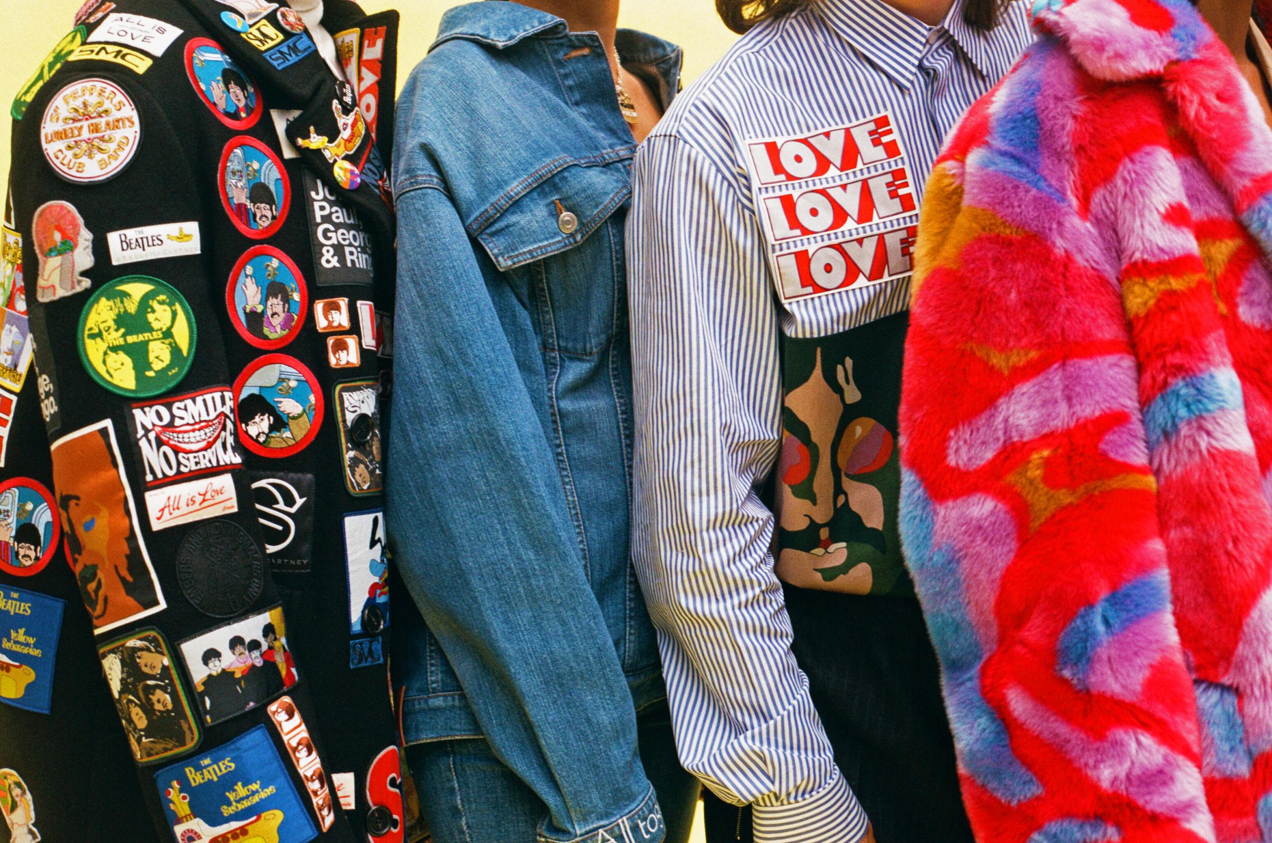 Menswear in the collection includes vibrant shirts decorated with pop-art portraits of members of the Beatles and intricately decorated patchwork coats.