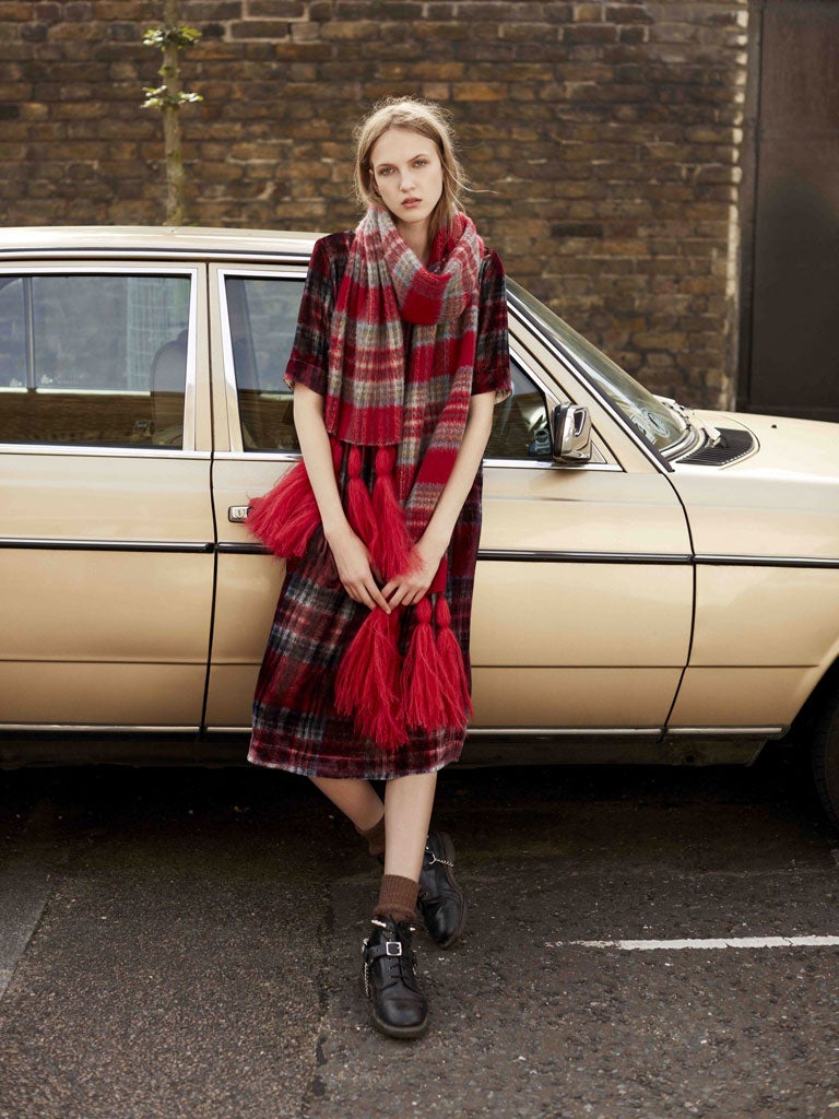 The duo’s design process begins with a print and a colour palette, though “not every print is suitable for both interiors and clothing,” explains Gormley, who has worked with neoprene and brushed wool to create the collection. “When designing clothing we keep the shapes and silhouettes contemporary. We want the clothing to feel modern and clean. This particular collection is inspired by the grungy Dalston-girl aesthetic, as well as evoking a more traditional British mood with the use of tartan and rose print.”