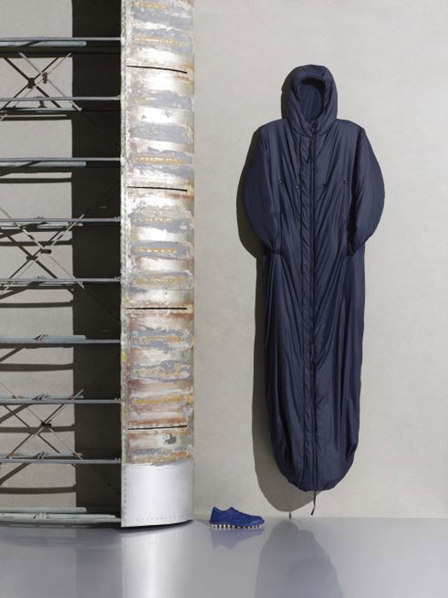 “I wanted to use Adidas’s expertise to resolve some inconvenient experiences I’ve had,” explains Dixon. “The long nylon parka that can be used as a sleeping bag came from a sad experience I had in once in Milan when I couldn’t find a place to stay and had to sleep in the park. I made items that willl fit right in to the busy world of a modern jetsetter. They are compact, fashionable and fully functional.” Another exceptional piece is an overall that can convert to a coat, jacket, trousers, skirt or shorts – bringing new meaning to the onesie.