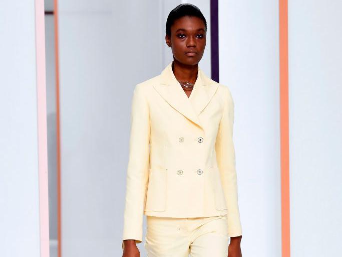 Elsewhere Sies Marjan presents a standout tonal pistachio number while Hermes proves delicacy can still be strong with double-breasted jackets in pale yellow.