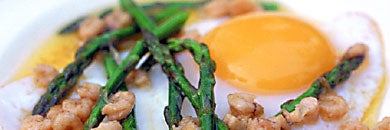 Our native asparagus is coming to an end, and this summer brunch or lunch for two is a good way of eating the last of the crop. At the end of the season farmers may sell on the little skinny off shoots, which are just right with a fried egg, or partnered with something tasty like these brown shrimps or crevette gris, or even some diced-up cooking chorizo. If you like the idea of the brown shrimps and can't find them, cheat by buying a tub of potted shrimps.
