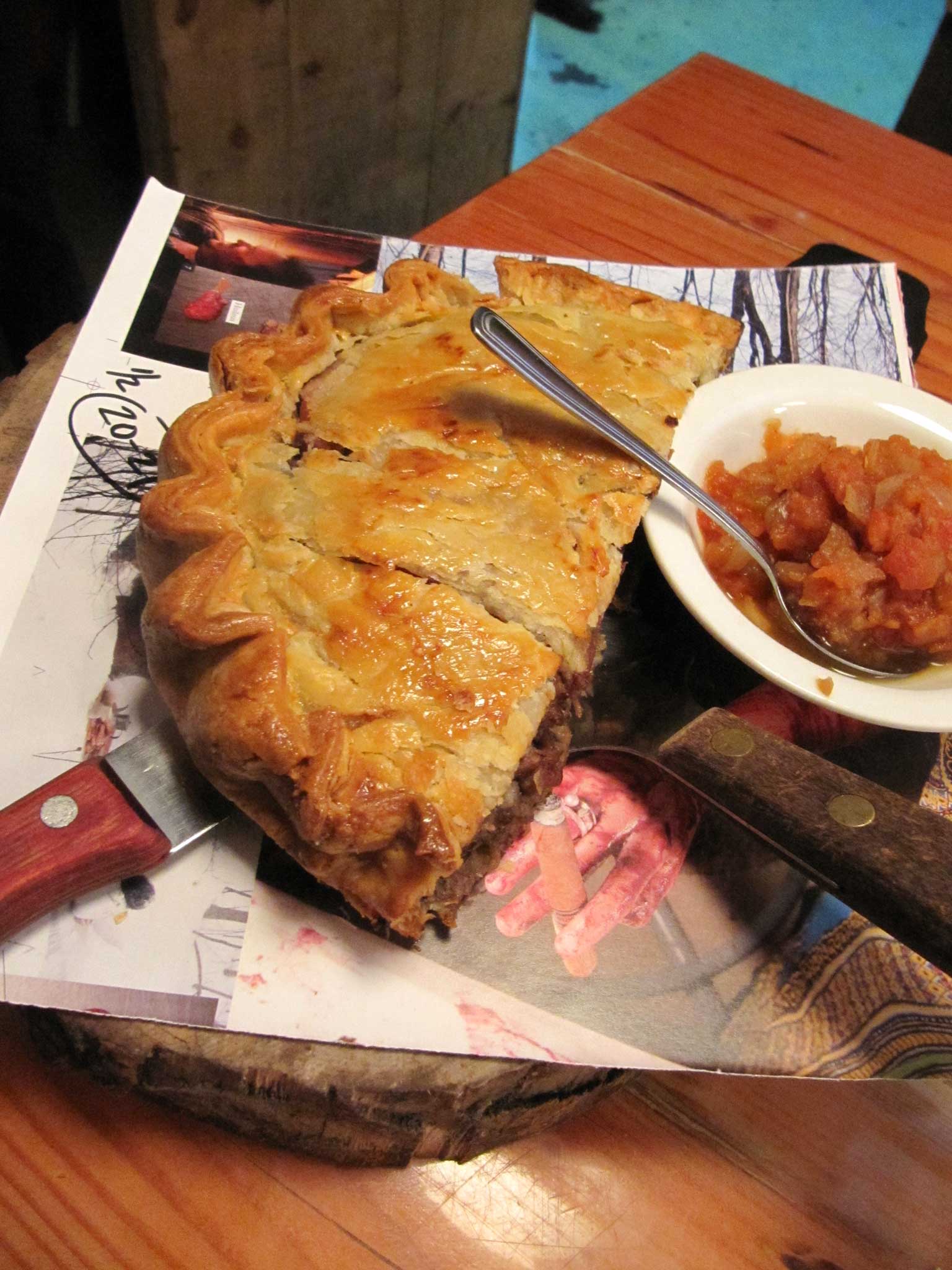 On it comes: half a Frisbee-sized tourtière, buttery pastry oozing meat (these sell at a rate of about 200 a week). The sturgeon sushi. And these, my friends, are just the starters.