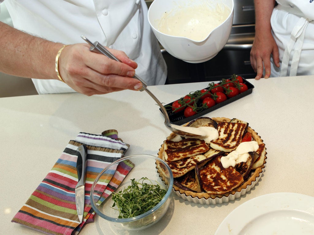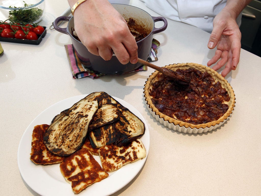 Pastry is precise: if you're into adding handfuls of flour to estimated-by-eye dollops of butter, it won't work out. But filled with onion jam, fried halloumi and aubergine, tomatoes, anchovies and capers, covered in ricotta and double cream and baked for 25 minutes, a shortcrust tart is delicious.