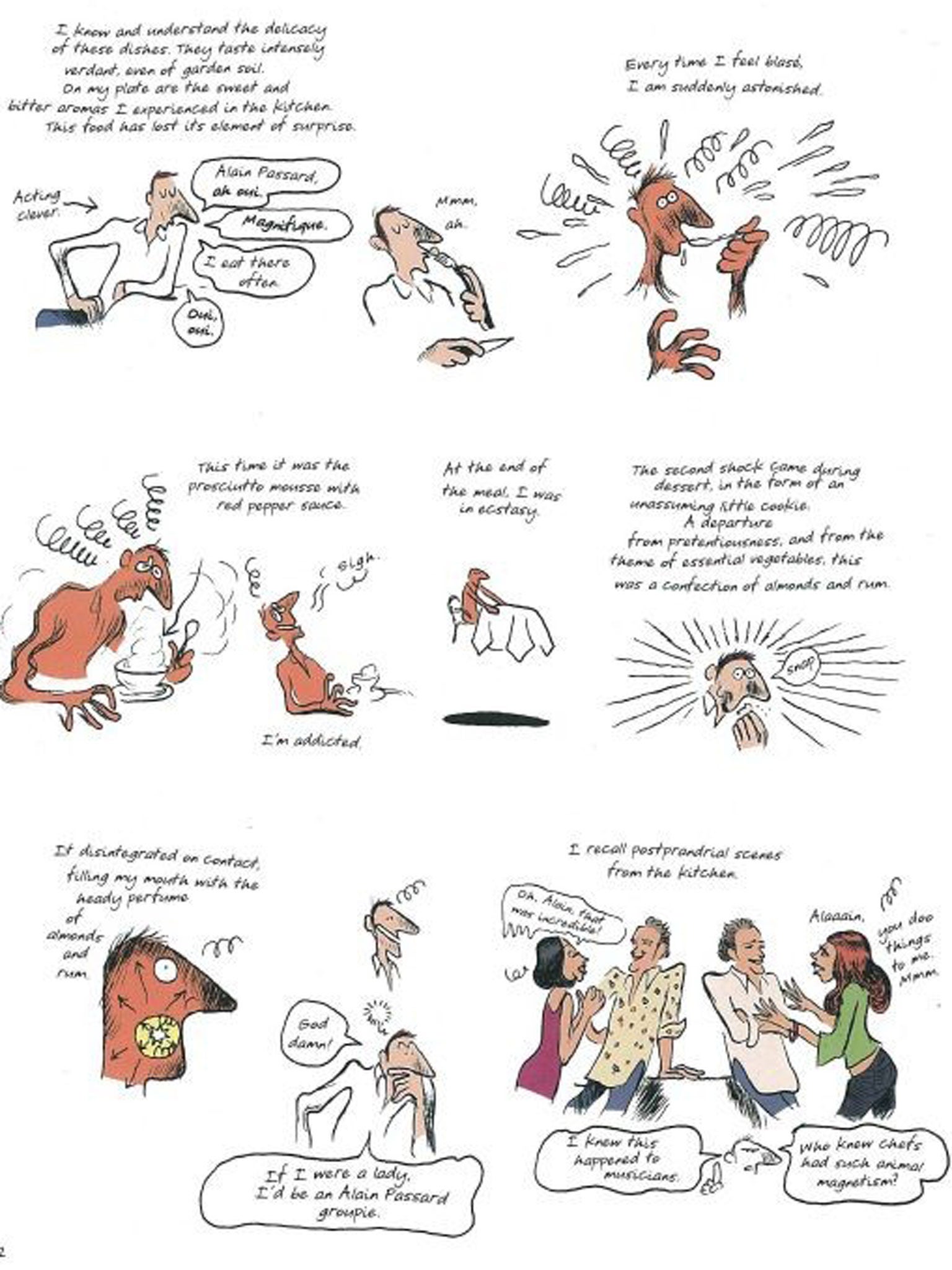 Blain said that initially it was Passard's idea to have an illustrator work with him on a book, as he thought it might help explain the process of putting together his recipes. But this developed into a series of cartoons, depicting the workings the chefs and vignettes from all aspects of restaurant life.