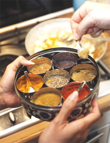 And Ayurvedic cooking is by definition healthy. Once the onions are chopped, we throw them into barely a tablespoon of sunflower oil. It's all the grease we'll add – no curries swimming in fat for us. The chicken goes in next to create what will become a wonderfully simple murgh soweta, or chicken with sweet corn. Once the meat is sealed we add the spices. Bharadwaj reaches across the sideboard for her beautifully colourful enamelled spice tin. For many would-be Indian cooks the world of spice seems difficult to navigate, but Bharadwaj says it's simpler than you might think. "Indian shops are full of colourful spices and it's easy to believe that everyone should have a great store of them, but I tend to use about seven spices for most of my cooking – turmeric powder, chilli powder, ground cumin, ground coriander, cumin seeds, black mustard seeds and garam masala."