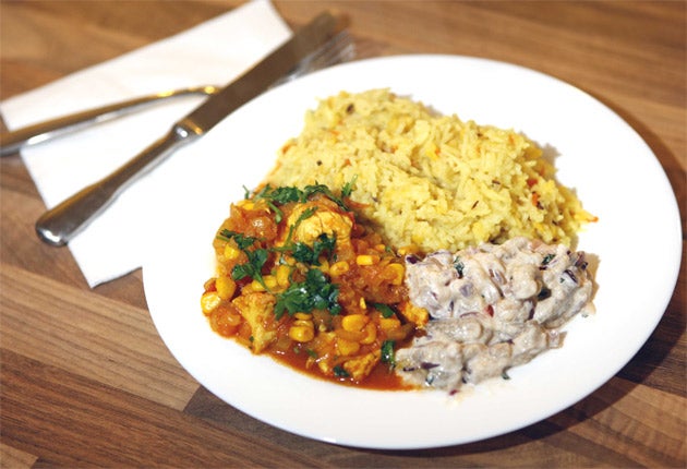 While that's simmering away Bharadwaj sticks an aubergine straight on the hob to roast it, mashing the smoky flesh and combining it with red onions and tomatoes fried in spices. Stirred in with some yoghurt it makes a terrific dip or, for our purposes, the perfect accompaniment to our rice and chicken dishes. It barely feels as if we've broken into a sweat, my onion tears notwithstanding, but there is now a plate of food in front of me. Take a forkful of even good-quality Indian takeaway and the potency of the spices and the heat of the oil explode in the mouth. But this is an altogether different feeling. The aubergines are delicately smoky with a delayed kick and the chicken tastes mainly of chicken. Best of all, there are none of those post-curry guilt pangs that accompany all the grease. Bharadwaj's food doesn't so much assault the senses as caress and comfort them. "That's Indian food," she says.