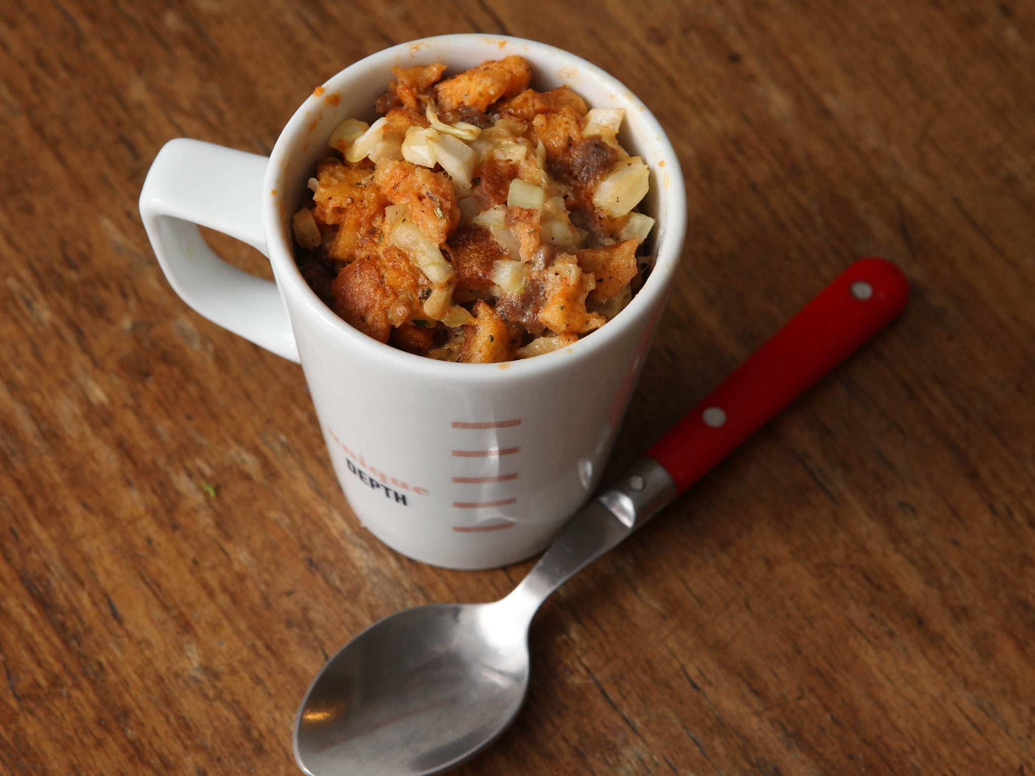 Combine all ingredients except the egg on the chopping board you used to chop everything up. Mound up the mixture, make a well in the centre, and fold the egg into the mixture without letting it drip onto the table. Leave it f or 30 minutes or so if your schedule allows, to allow the bread to soak up the egg. (You can also use a small bowl for this if you don’t mind getting something else dirty.) Pack the mixture into your mug, trying to make it just level with the rim. Microwave at medium power for five to six minutes, checking its progress once or twice. Leave to cool for at least five minutes so the heat can equalise between the edge and the centre: when the mug first comes out, the heat differential may be as much as 10C. Can be eaten hot, cold, or (best of all) warm.