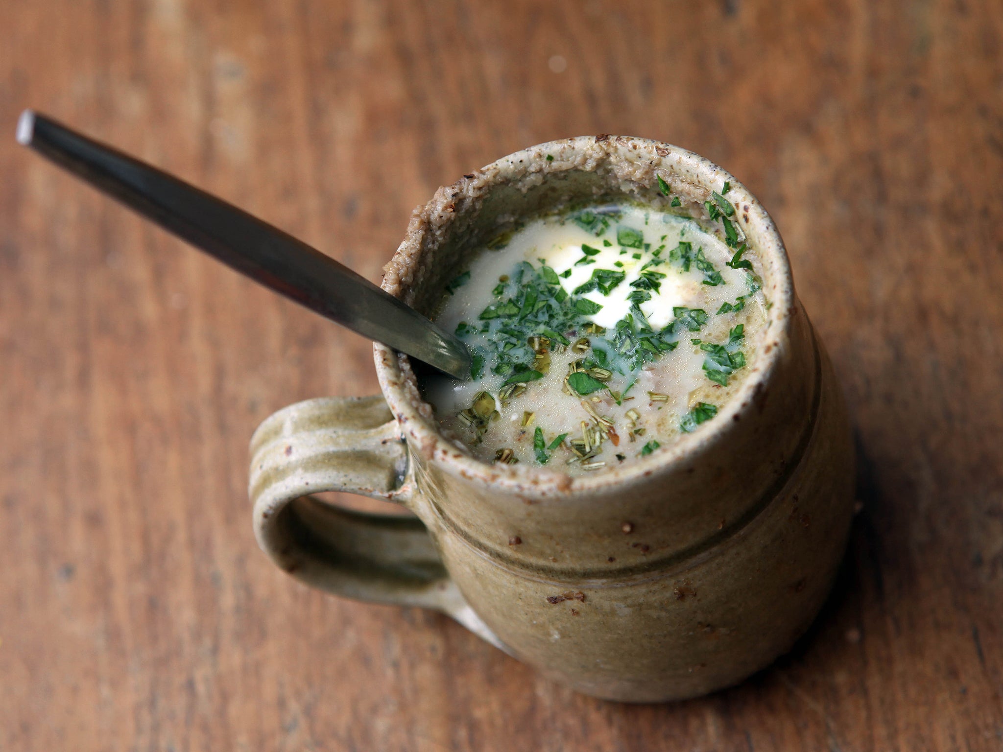 Put the garlic, shallot, butter and wine in your mug. Microwave at medium power for one minute. Now add the mushrooms and season with salt and pepper. You may be alarmed at how they fill or overfill the cup, but fear not: they will cook down to almost nothing. Cook at medium power for one minute, then tamp down the mushrooms. Repeat, tamp and stir. Repeat two or three times, until the mushrooms are cooked down to around a quarter of their original volume and are nicely soft. Now add the thyme, milk and nutmeg. Stir well and microwave at full power for one to two minutes, till the liquid is hot. Stir in the yoghurt, garnish with the parsley, and slurp away.