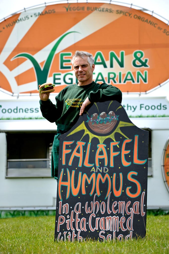 Back when I first started going to festivals as a kid, it wasn't complete without a trip to the vegan and vegetarian stall for falafels. Cast your mind back to the early Nineties: falafels were rare and exotic things, and the giddy height of festival food. On the road since 1989, Goodness Gracious really were one of the first to serve alternative food – indeed, that was why owner Barry Tiffen set it up: there was nothing for him, as a veggie, to eat at festivals. "We can probably be fairly responsible for putting falafels on the circuit," he agrees. "When we started we had to explain what a falafel was, what tahini was... now everyone knows."