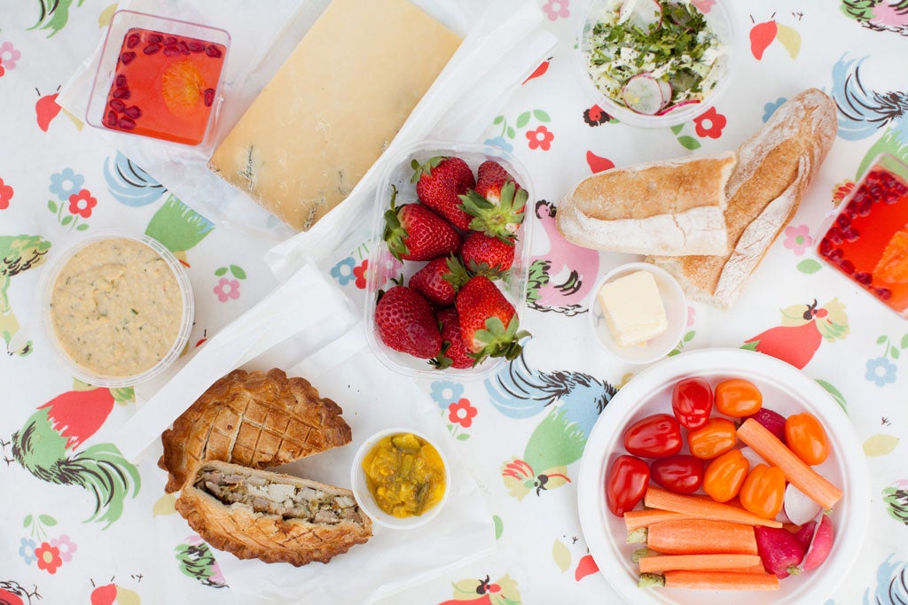 Tracey's verdict: Deli-traiteurs of choice to the Primrose Hill set – I once queued there behind Sharleen Spiteri, who was buying startlingly overpriced Tunnocks teacakes – M and M's offering arrived in the sharpest packaging, complete with modernist red lettering. A chicken, ham and leek pie, with shiny cross-hatched crust, was good, as were the individual tubs of orange jelly, with pomegranate seeds and mandarin slices held in shimmering suspension. We also enjoyed a pale and interesting slaw of celeriac, radish and celery. A slab of nutty Montgomery's cheddar, and a tub of houmous with bendy crudités, we could have bought ourselves. More of a deli assembly than a picnic, but perfect for a group of young and foodish friends to eat on the top of Primrose Hill.