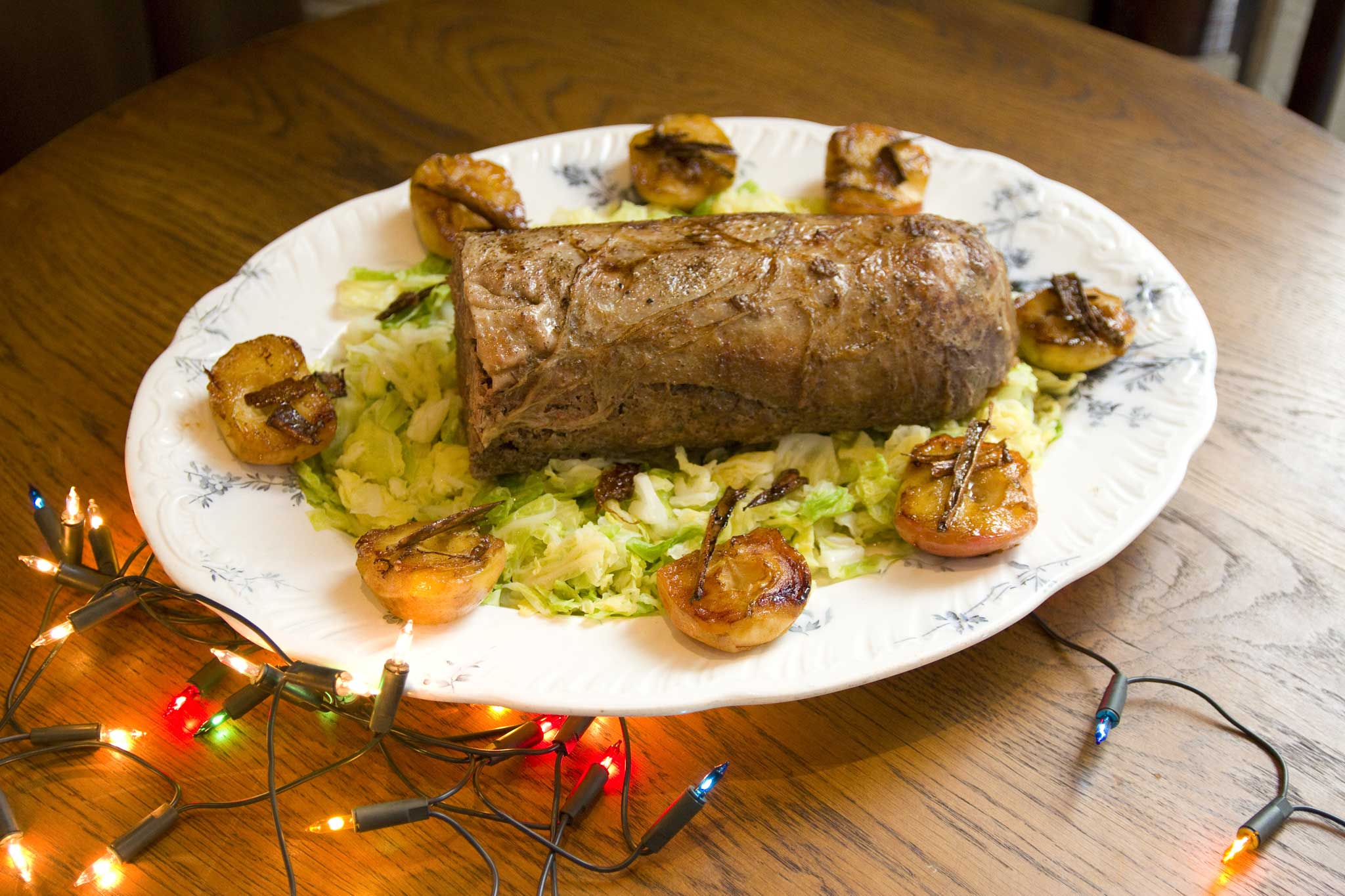 To serve, slice the ballotine and place on a platter over the cabbage with the apple presented around the edge. Serve the sauce in a sauce boat.