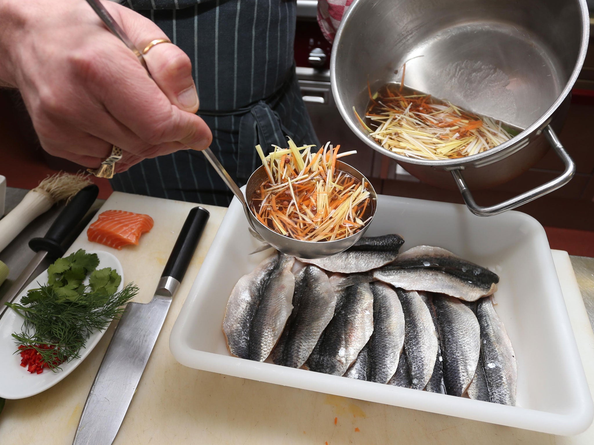 "I started curing and salting beef, progressed to pastrami and salami, then turned my attention to pickled fish and vegetables." For which read beetroot, carrots with lemongrass, cucumbers, Japanese vegetables, salmon, mackerel and sweet pickled herring, which he infuses with Szechuan peppercorns, mace, coriander and mustard seeds before steeping in malt vinegar and brown sugar for 24 hours. Such "day pickles" – they include "new greens", the still-bright green and crunchy cucumbers the best delis spice and acidify only briefly – are the modern take on the sousing, or hot pickling, technique originally introduced to Britain to preserve food.