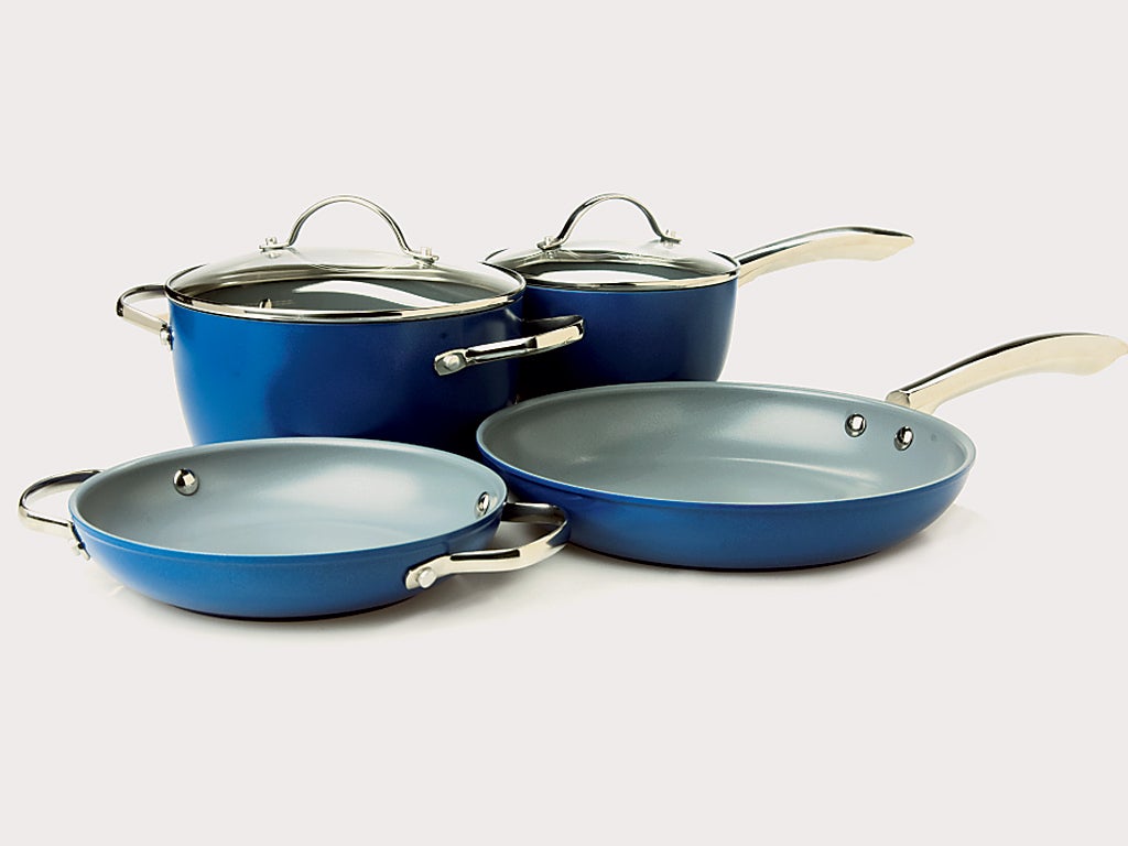 Heavy-grade aluminum pans are coated with a non-stick Teflon interior, have soft-grip handles, glass lids and a 25-year guarantee.