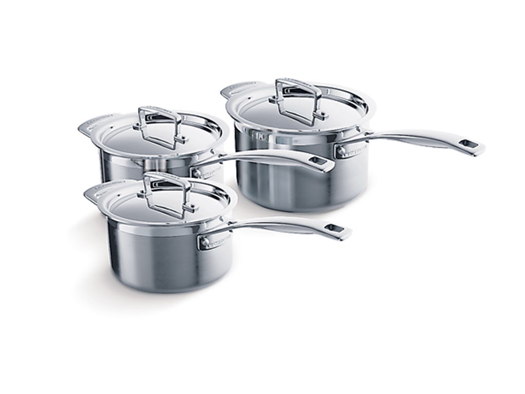 A three-pan set that has an all-round pouring rim, capacity markings and easy-lift handles. And a 10-year guarantee.