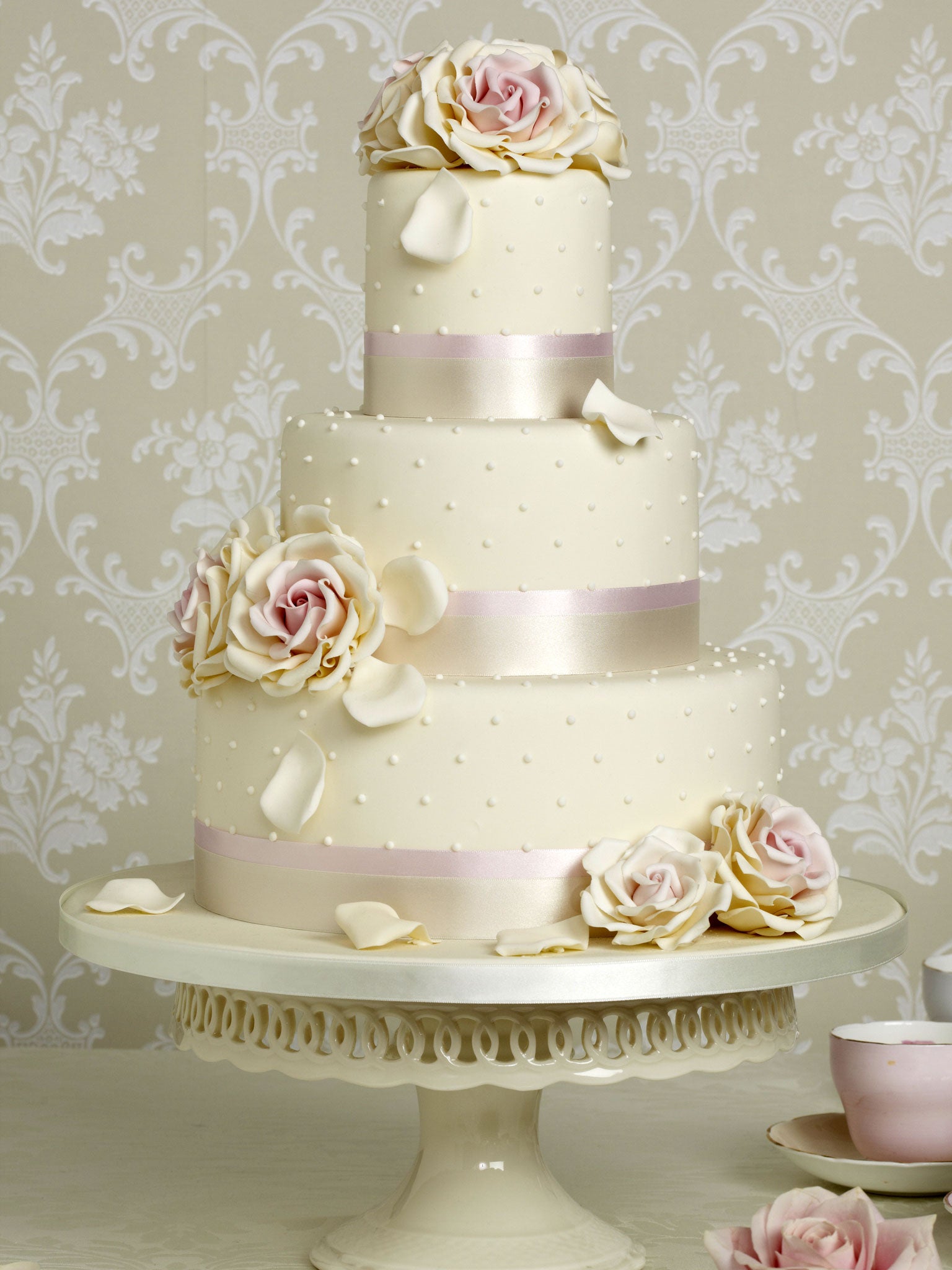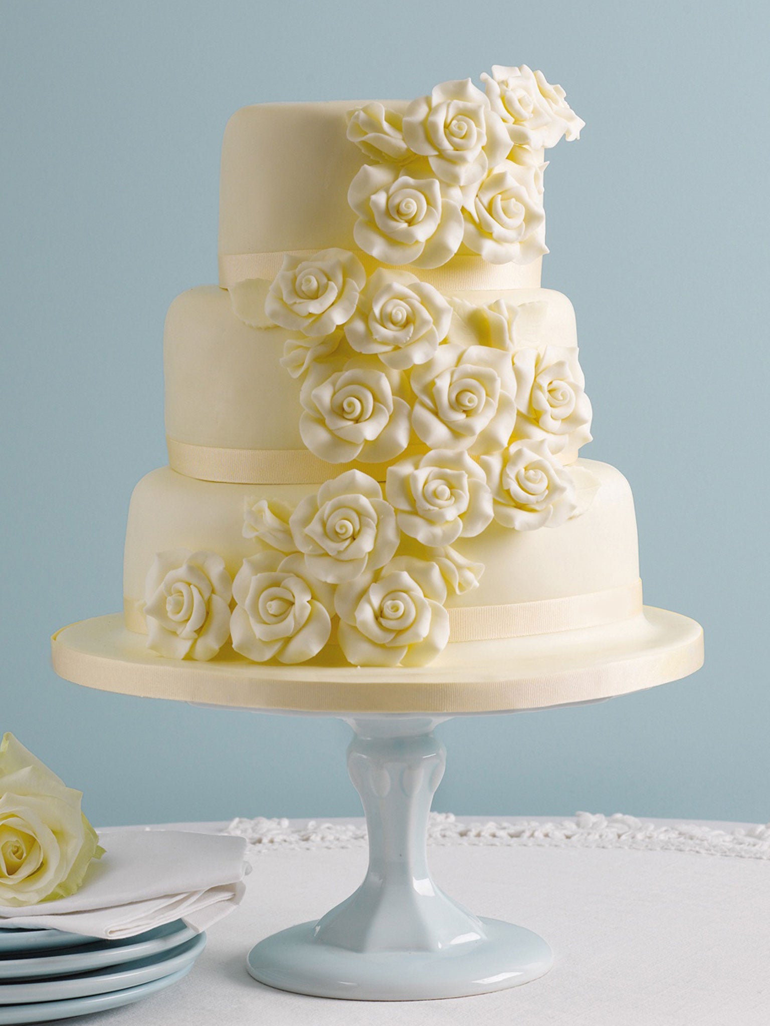 Guests aren't likely to guess the bargain price of this classic-looking, three-tier, cream-coloured cake decorated with cascading soft icing roses. The all-butter sponge is light and springy, lined with rich, not-too-sweet buttercream, and the double-layered icing is white-chocolate flavoured.