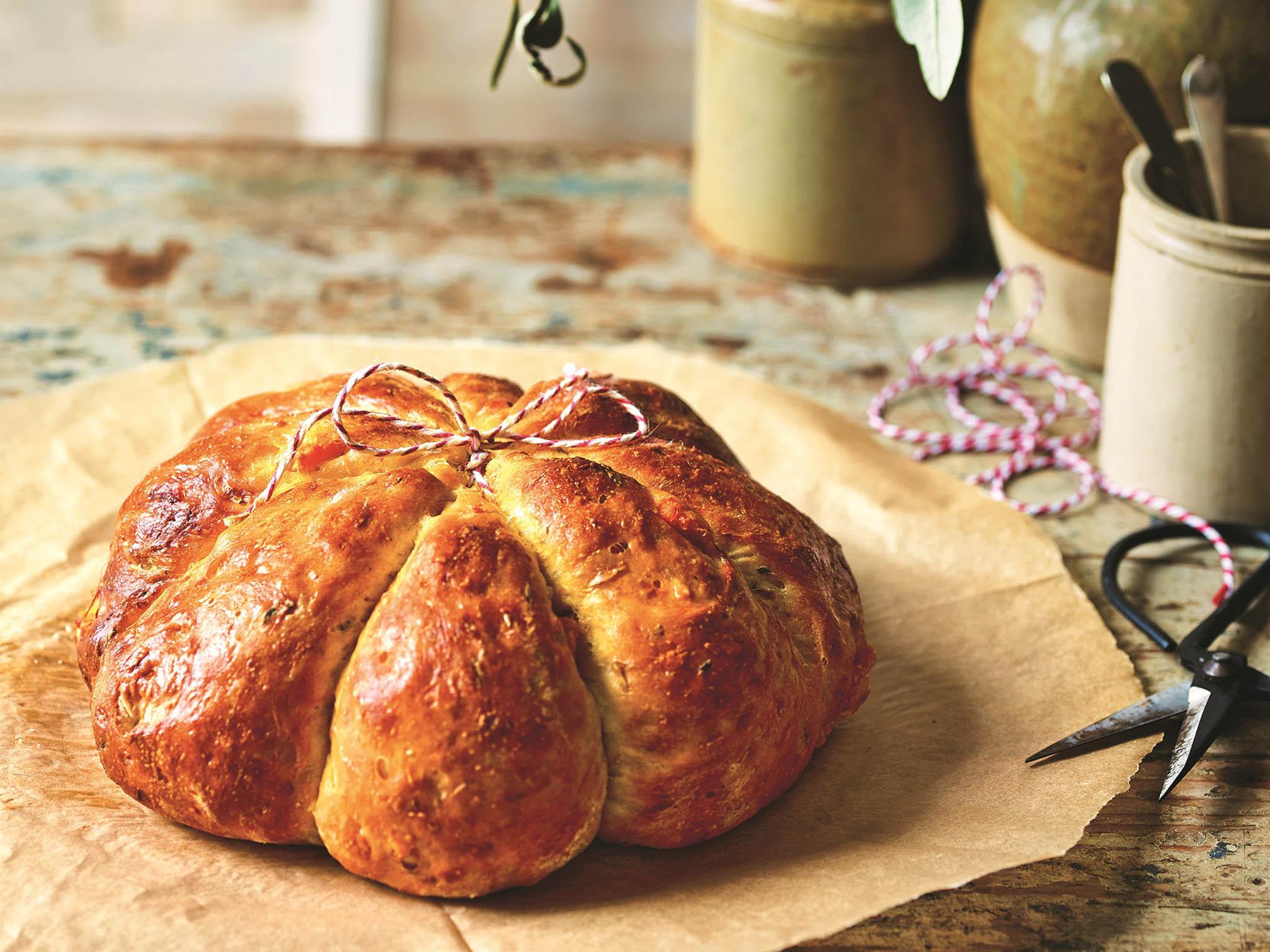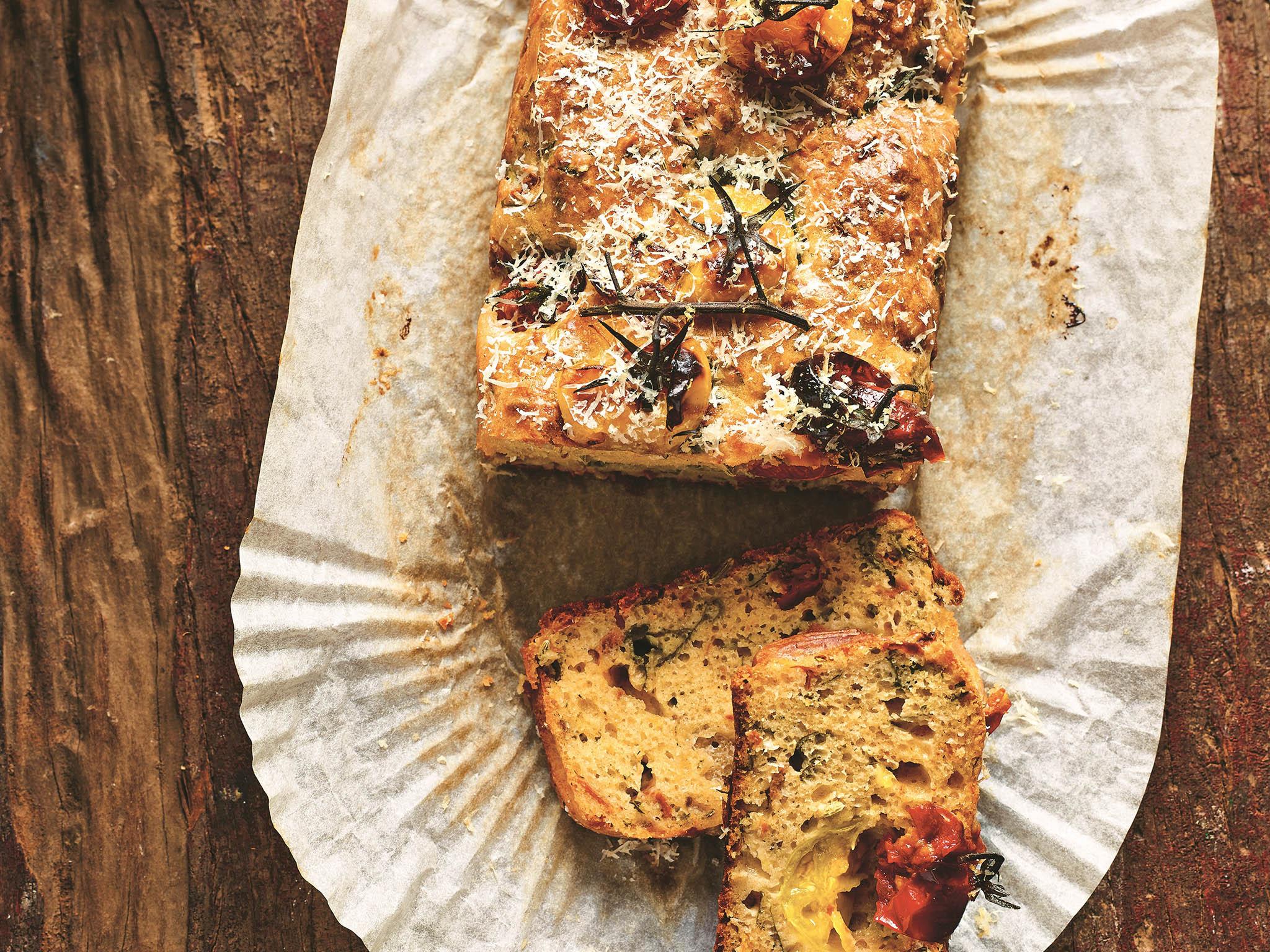 This deliciously moist and aromatic tomato loaf is more like a savoury cake, hence the absence of yeast and no proving time. I urge you to use good-quality preserved sun-dried tomatoes – if necessary, buy the dried ones and marinate them yourself with olive oil, garlic, dried oregano and some chilli for a couple of days in a sealed container before using. This loaf makes a wonderful addition to your bread basket or you can eat it on its own as a snack. It also looks very pretty!