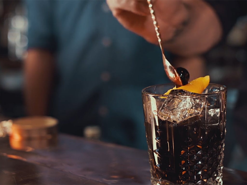 Here, bar manager Cristian Cuevas, shows how to make the black charcoal Old Fashioned cocktail, with Daniel Futong, manager at the Drunken Monkey.