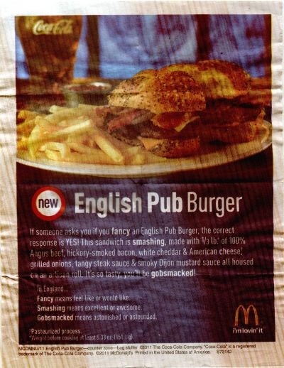 First spotted by blogger Within the Empier who sampled the new product in Illinois, McDonald's burger ode to Britain also comes wrapped in exclamation-marked advertising that tries to emulate Brit-talk, with terms like "gobsmacked," "fancy" and "smashing," all of which come with translations.