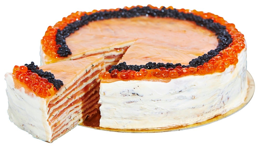 Layers of Severn and Wye smoked salmon, delicate crêpes and light smoked-salmon mousse topped with avruga and salmon caviar and cream-cheese ‘icing’.