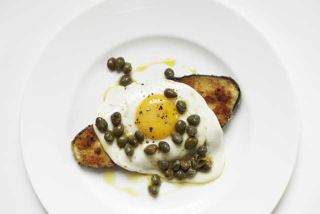 To serve, place the aubergine on a warmed serving plate with the egg on top. Heat the butter in the pan that the egg was in until it's foaming, then remove from the heat, add the capers and spoon over and around the aubergine and egg. If you wish, you can sprinkle over a little chopped parsley at the end just before serving.