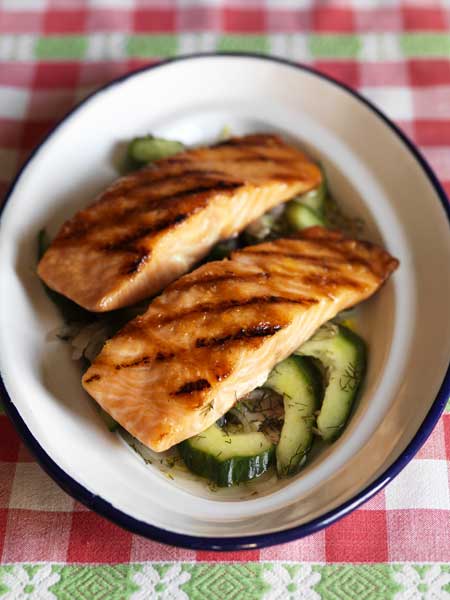 Barbecued salmon with soused cucumbers