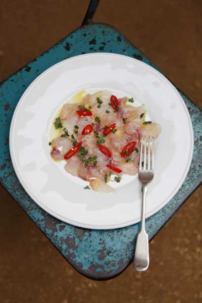 Drizzle over the lemon juice and olive oil. Scatter over the marjoram and chilli, and finely season with salt. It is important to season the fish well, for this is what will bring the dish to life – not too little but definitely not too much. Serve at once.