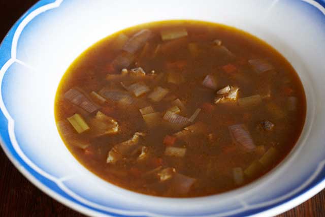 Add the spelt and simmer for about 20 minutes, add the other veg; simmer for 10 minutes. Remove as many bits of meat from the game carcass as possible and add to the soup. Simmer for a few minutes, re-season and serve.