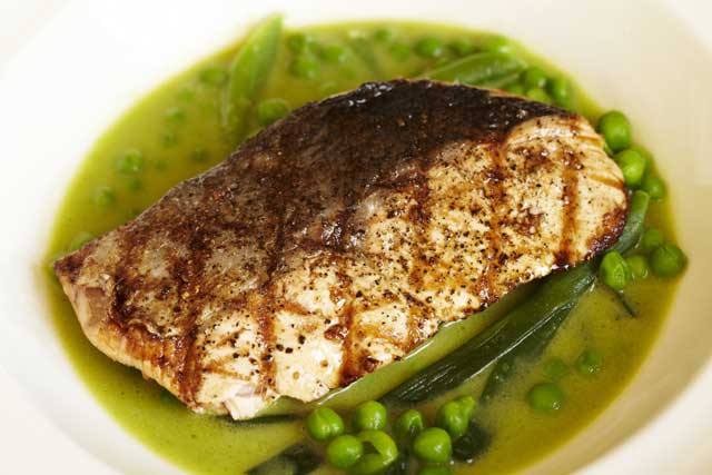 Grilled salmon with pea and leek broth