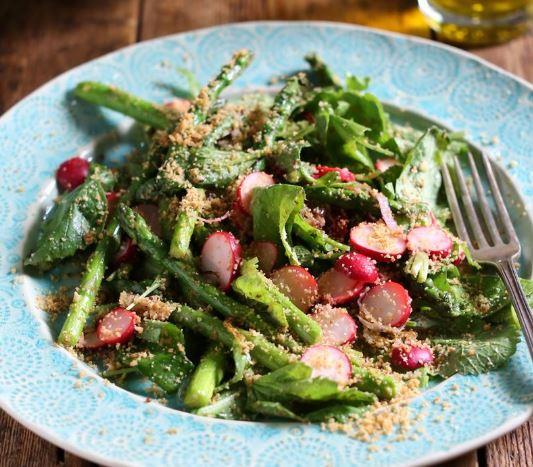 Tip the cooked asparagus and shallots into the bowl with the salad dressing. Add the radish leaves, wild garlic leaves and the pickled radishes . Toss to combine. Divide the salad between two warm plates and sprinkle with the golden breadcrumbs.