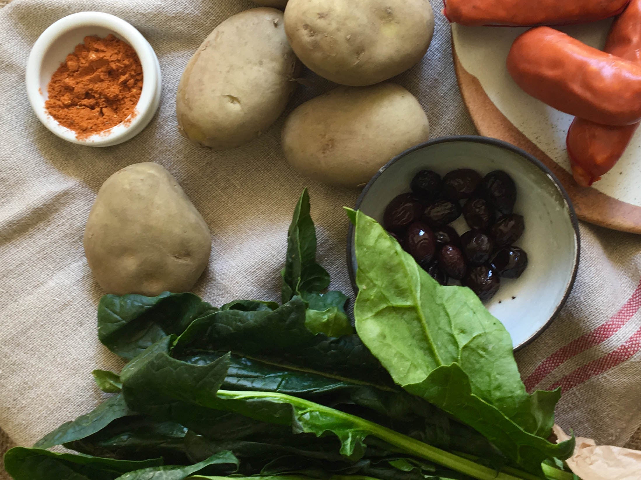 While the potatoes are cooking, wash the spinach thoroughly and remove and discard the thick stems. Spin the leaves, leaving a bit of the water on the leaves. Pit the olives and discard the pits.