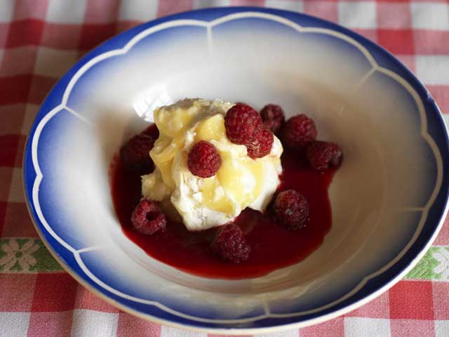 Spoon the raspberry purée on to serving plates, then spoon the cream mixture on top and scatter over the rest of the raspberries.