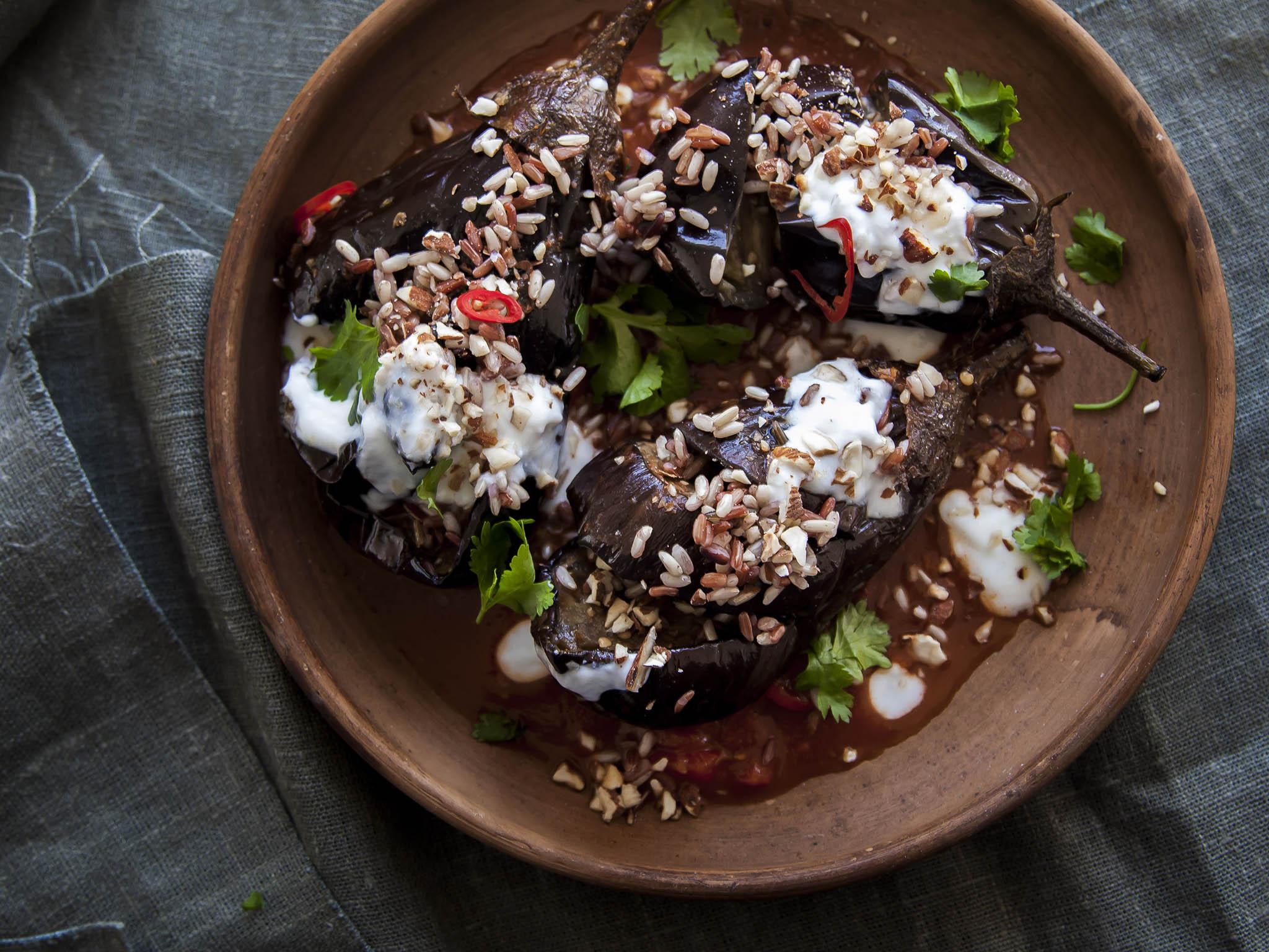 While the aubergines are cooking, cook your wild rice in a pan of salted water according to pack instructions. Drain the rice and keep warm until you’re ready to eat.
