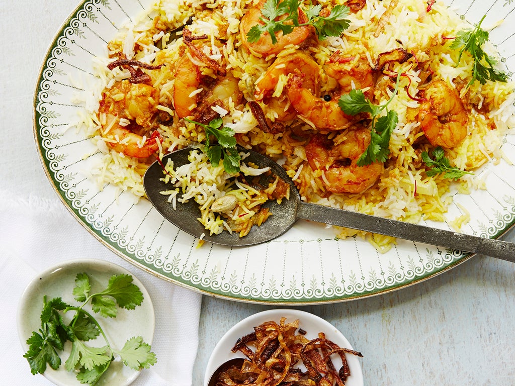 Heat the oil and ghee in a large, heavy bottomed saucepan which has a lid. Add the whole spices and cook for 30 seconds or until aromatic. Add the onions and ½ tsp. salt and cook until soft, stirring occasionally, then turn the heat up and cook until golden. Meanwhile, drain the rice and add it into the golden onions. Stir well over a high heat to dry off any excess water and coat the rice in the oil for about 2-3 minutes. Add your water to the pan, taste and season well. The water should taste a little salty or the rice will be a bit flavourless. Add 1 tsp. of the lemon and extra curry leaves, slightly torn. Bring to a boil then cover and turn the heat right down. Cook undisturbed for 7-8 minutes then test a grain. If it is done, take off the heat and set aside for 10 minutes then spoon the rice out onto some open plates to prevent them overcooking. You can use this pot for the final assembly.