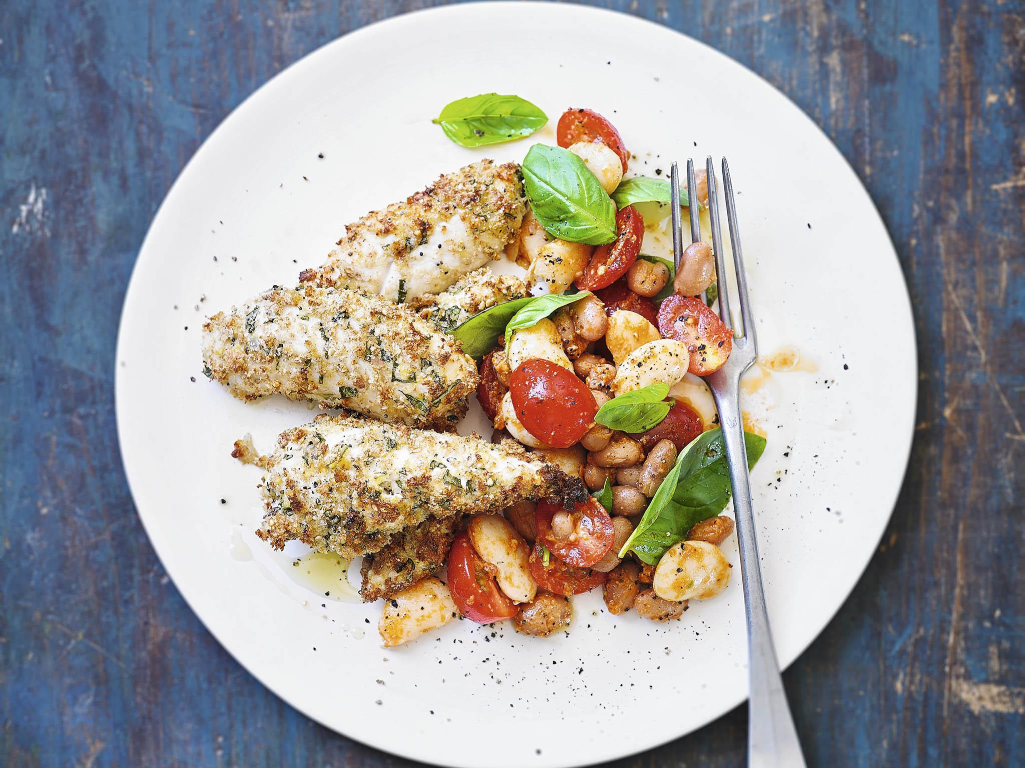 Meanwhile, mix the beans, tomatoes, pesto and remaining basil, season and serve with the goujons.