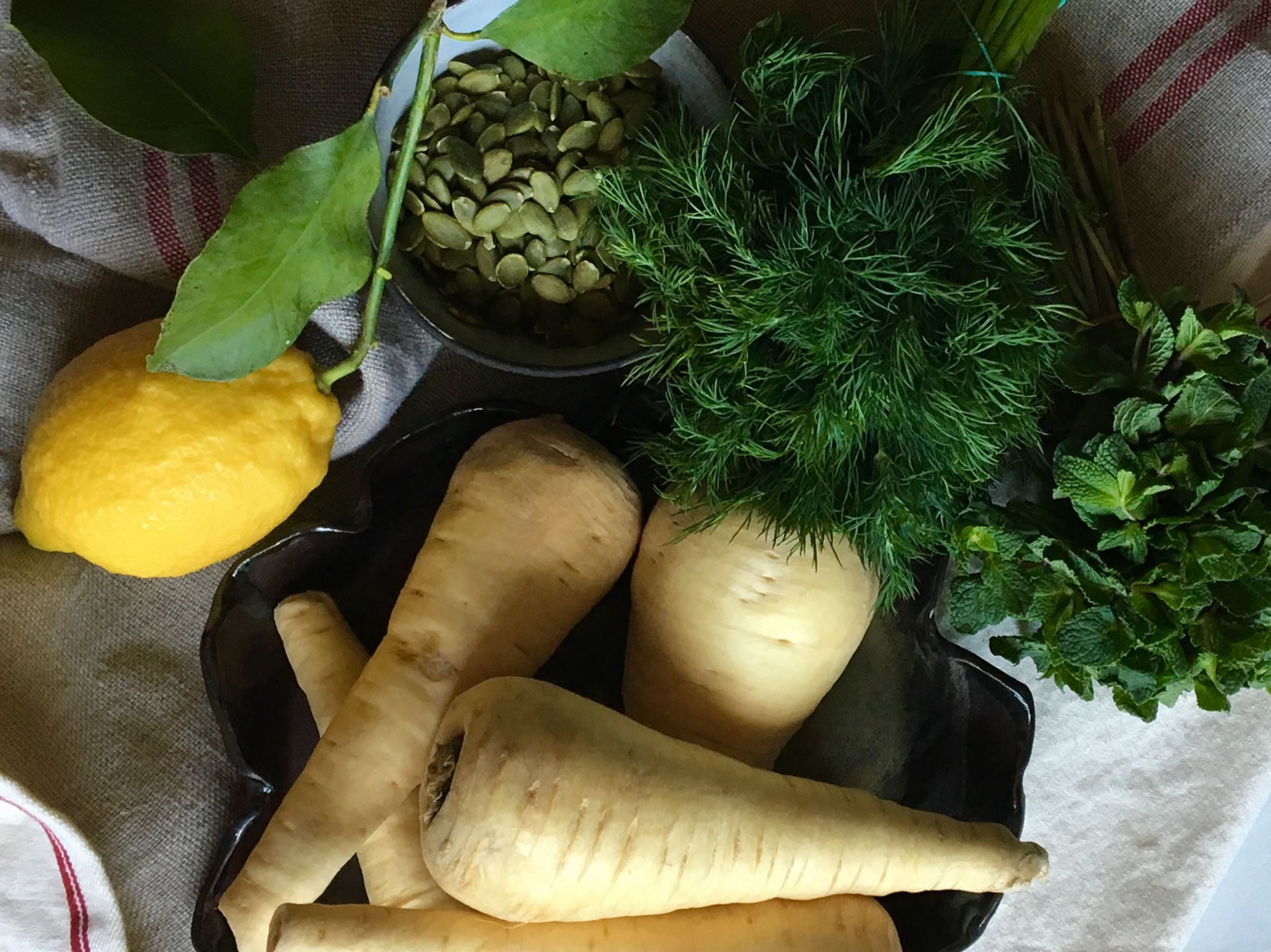 Roasted parsnips with a lemon, herb and pumpkin seed pesto