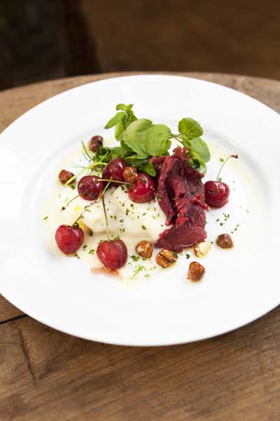 The contrast of sharp, sweet cherries and smoky, delicate bresaola (air-dried, salted beef) is very pleasant: the gentle creaminess of the ricotta is needed here to link the flavours together.