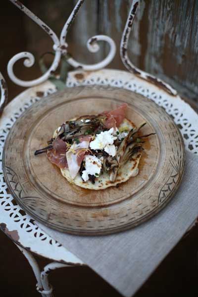 Return to the middle shelf of the oven. Bake for 10 minutes, until the outer crust is light brown and the ricotta has begun to melt. Remove from oven; the base should be dry. Allow to cool slightly, then serve with finely sliced Parma ham.
