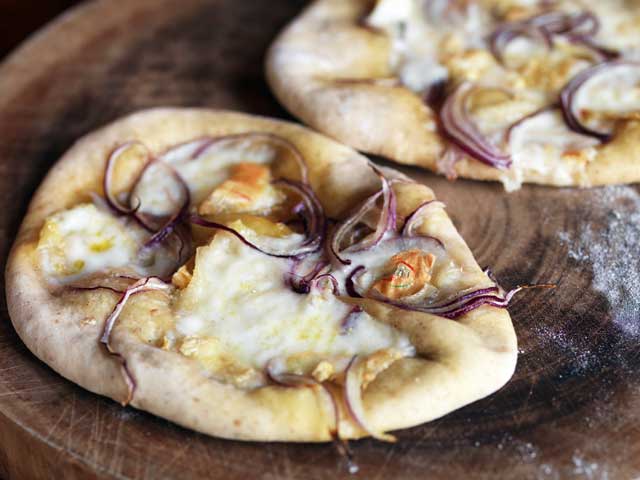 Lightly oil your hot baking tray and lay the Taleggio on the dough (allowing space for it to spread as it melts) and scatter a few red onions over. Add some ground black pepper, drizzle with a little olive oil and bake for about 10 minutes until the dough is crisp; serve immediately.