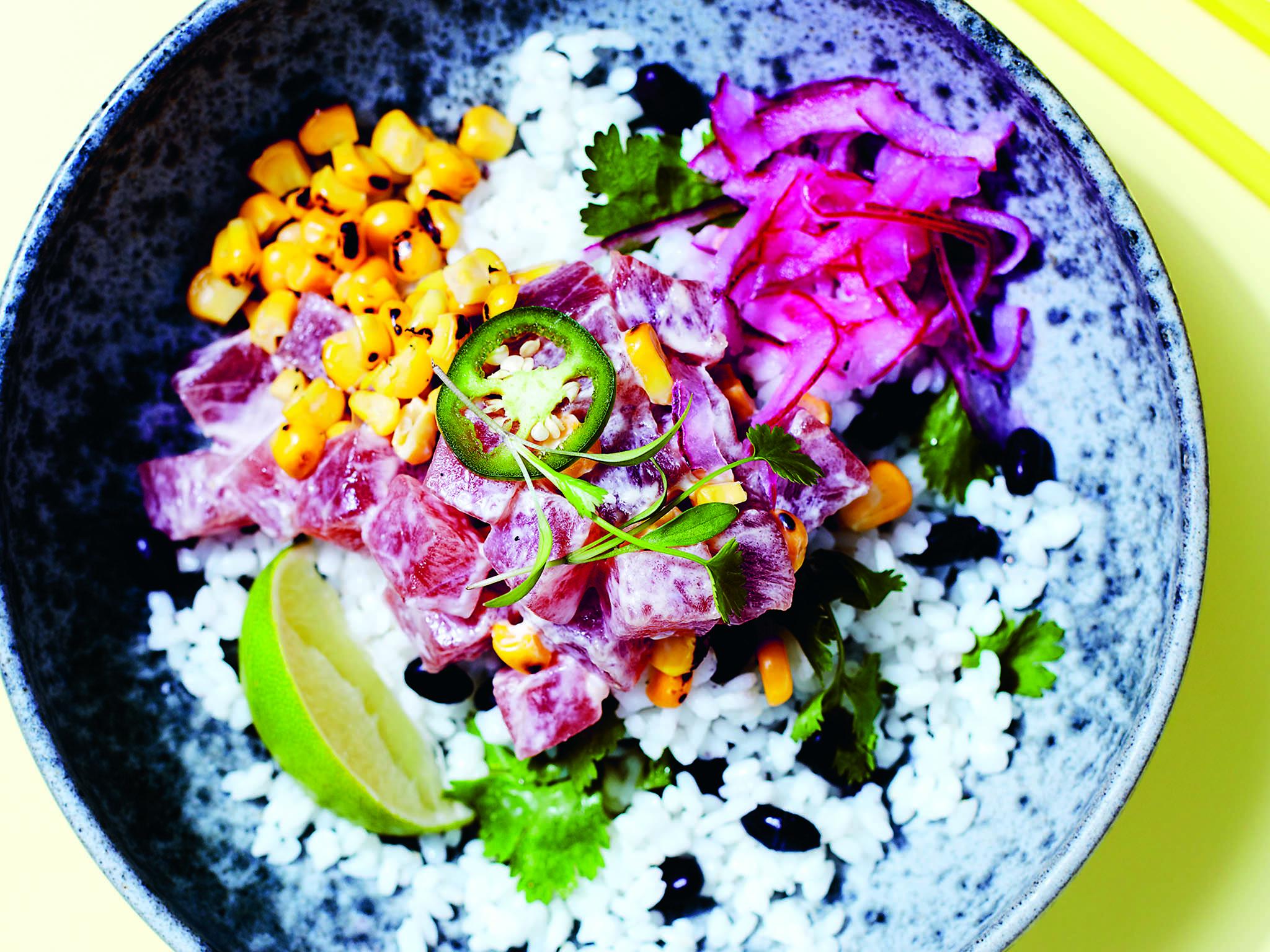 Combine the tuna with the marinade ingredients. Assemble the dish, starting with the rice and bean mix, then the marinated tuna and the corn. Drain and dry the red onion and place on top. Serve each bowl with a wedge of lime and green chilli.